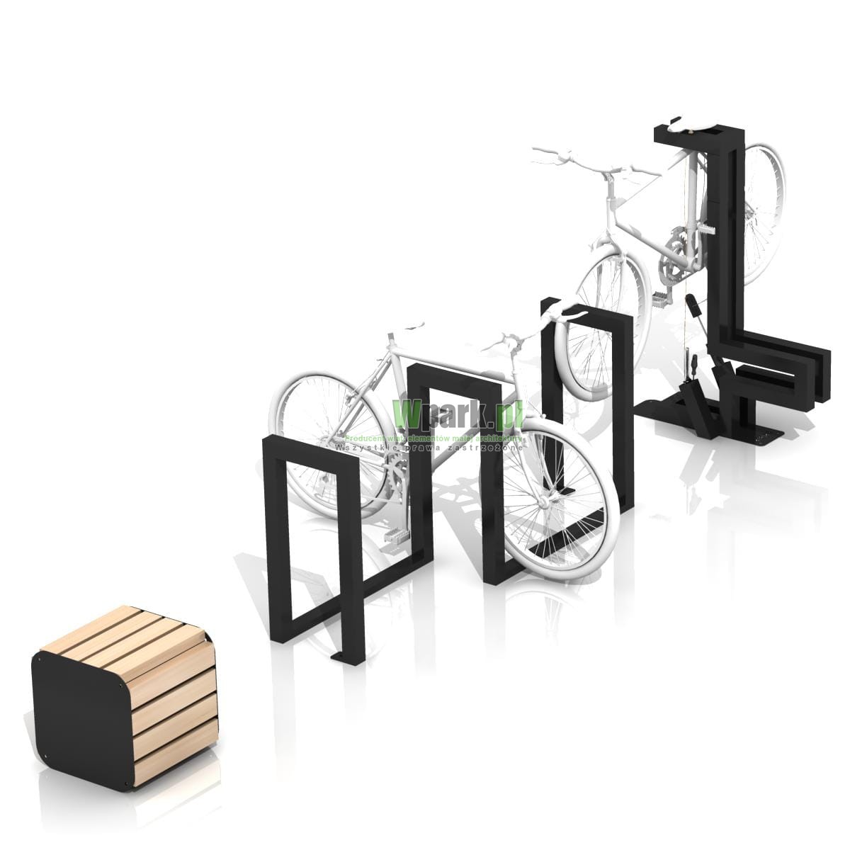 - stojak na rowery na którym można powiesić rower, włożyć rower z przodu lub z tyłu, może być siedziskiem