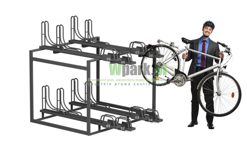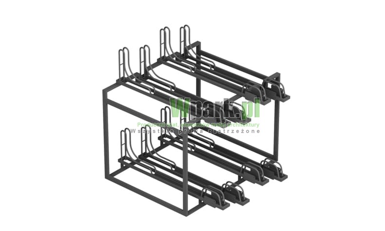 Parking może być stosowany w garażach podziemnych jaki i na zewnątrz. Można łączyć moduł 8 stanowiskowy ze sobą tworząc parkingi wielostanowiskowe np na 16, 24, 32 stanowiska rowerowe