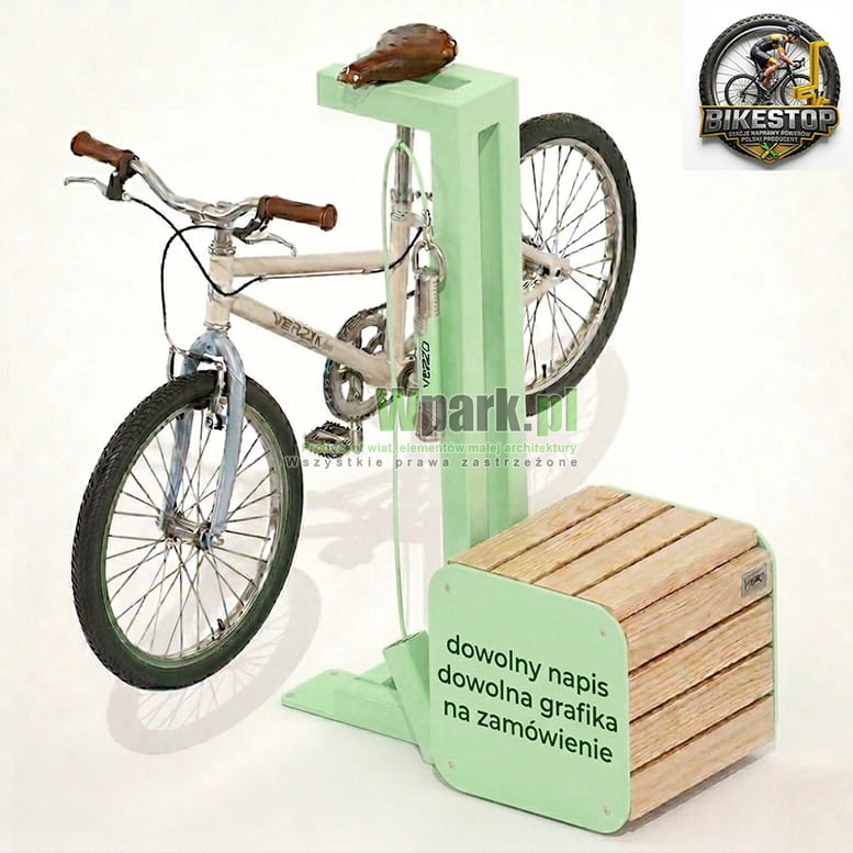 Stacja naprawy rowerów BIKESTOP z dowolnym napisem lub prostym logiem wycinanym laserowo