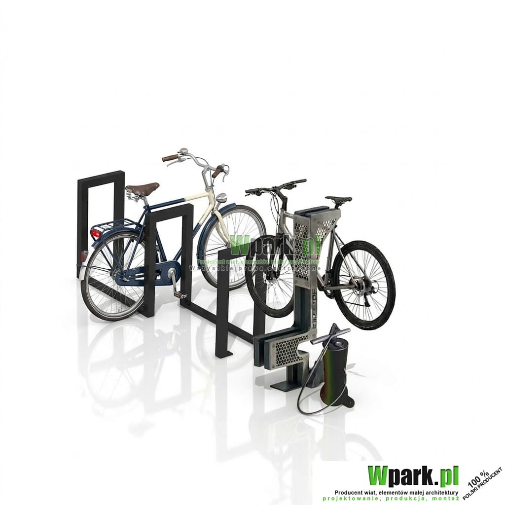 - stojak na rowery na którym można powiesić rower, włożyć rower z przodu lub z tyłu, może być siedziskiem