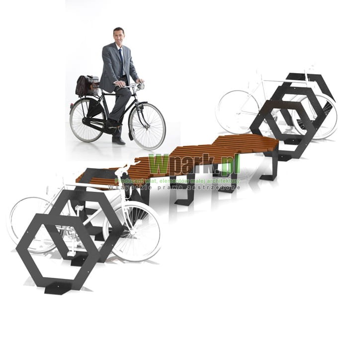 W skład zestawu wchodzą jak na zdjęciu ławki, donice, stojaki rowerowe